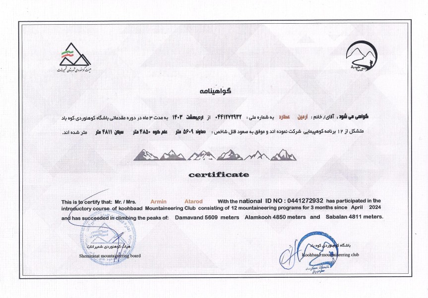 Certificate of Climbing the Three Highest Summits of Iran